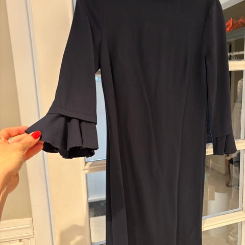 Elinette. Blå klassisk kjole med sorte detaljer, passer str. 38/M. 100 kr.