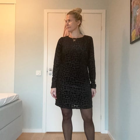 Vero Moda sort, kort paljettkjole (vanlig stoff bak). Str. L, ingen stretch. 50 kr.