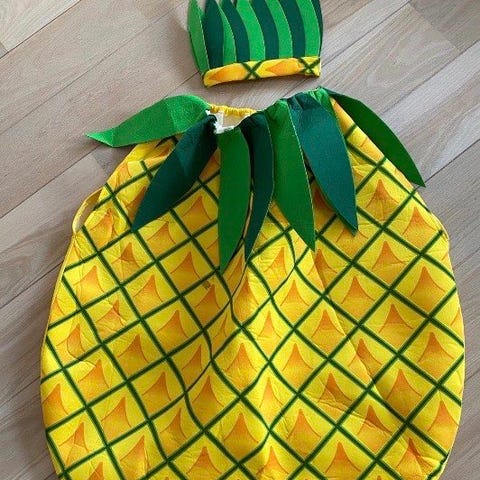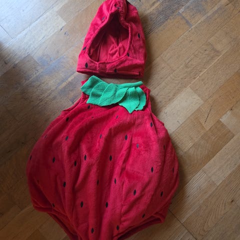 Unisex jordbær kostyme i rød farge med svarte detaljer som etterligner jordbærfrø. Kostymet har en hette med grønne blader og en elastisk åpning ved midjen for tilpasning. Laget av mykt stoff, egnet for bruk ved kostymeanledninger. Størrelse 2 til 4 år