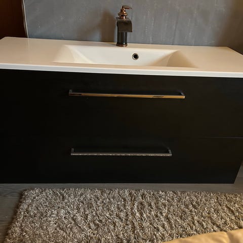 Baderomsinnredning med svart ramme, inkludert glassvask, speil og høyt skap. Bredde på 100 cm, høyde på 83 cm og dybde på 56 cm for hoveddelen. Speilbredde 90 cm og høyde 82 cm. Kommode med bredde 35 cm, høyde 160 cm og dybde 35 cm.