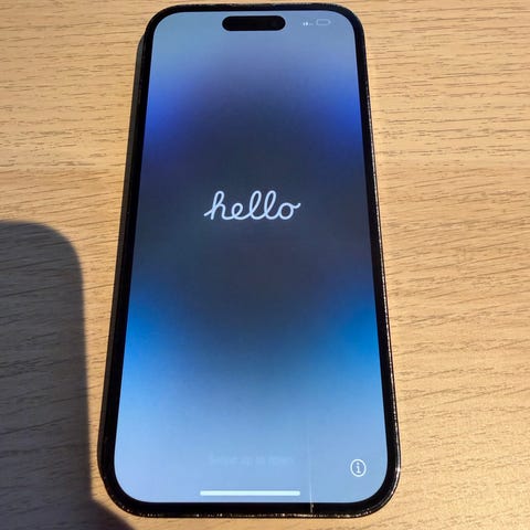 Apple iPhone 14 Pro mobiltelefon med 512 GB lagringskapasitet. Enheten har en skjerm med oppstartsside synlig og kommer i en beskyttende gjennomsiktig deksel. Telefonen støtter flere språk og er designet for personlig bruk.