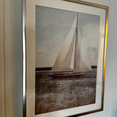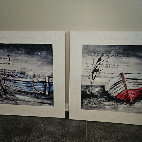 2 pene svart-hvitt maritime bilder av båter, innrammet i mørk brun treramme med passepartout. Oppheng bak. Måler 23,5cm høyt og 28,5cm bredt. Hentes på Torshov. Heis. Buss 20 og 30 stopper rett utenfor.