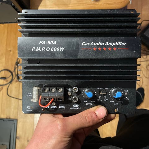 Jeg selger en Black Cube 2.4 bilforsterker (endstufe) som kan brukes som 4-, 3- eller 2-kanals (blant annet ved brokobling til 2 kanaler). Spesifikasjoner (oppgitt): drift 12 V DC (bilbatteri), vekt 3,05 kg, mål (B x H x D) 250 x 60 x 320 mm, maks effekt 4 x 600 W / 2 x 1.200 W, RMS effekt 4 x 60 W / 2 x 120 W, frekvensområde 10–40.000 Hz, lavpass 40–300 Hz (12 dB/okt), høypass 80–1.200 Hz (12 dB/okt), inngangsfølsomhet 0,4–5 V, inngangsimpedans 33 kΩ, signal/støy > 100 dB, kanalseparasjon > 60 dB, THD (klirrfaktor) < 0,05 %, sikring 2 x 25 A.