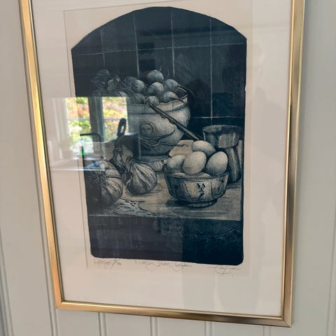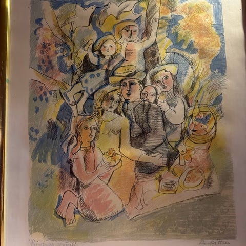 ThorsteinRittun signert kunsttrykk med nummer 136 av 150. Bildet viser en gruppe mennesker i fargerik stil med blå, gul og oransje toner. Trykket er innrammet og signert av kunstneren.