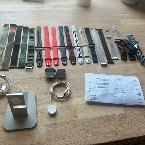 Apple Watch svart smartklokke med reim i svart materiale. Enheten har en firkantet skjerm og er designet for bruk på håndleddet. Man ser at klokken er godt brukt. Men er fortsatt fult brukbar. Passer fint for noen i den yngre garde som ønsker seg en smart klokke.