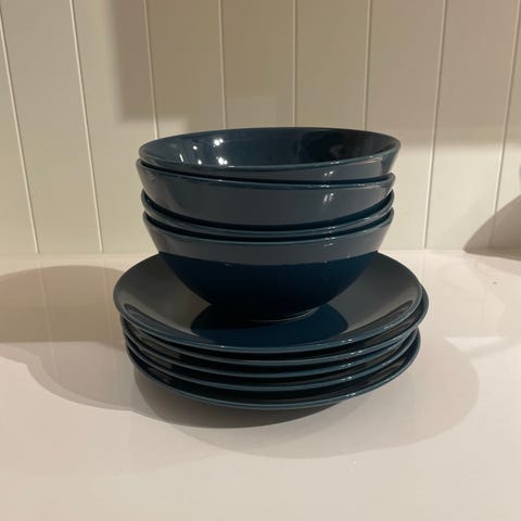 IKEA servise bestående av tallerkener i ulike størrelser selges samlet. Diverse kopper og skål kan følge med på kjøpet eller kjøpes for en billig penge alene.
