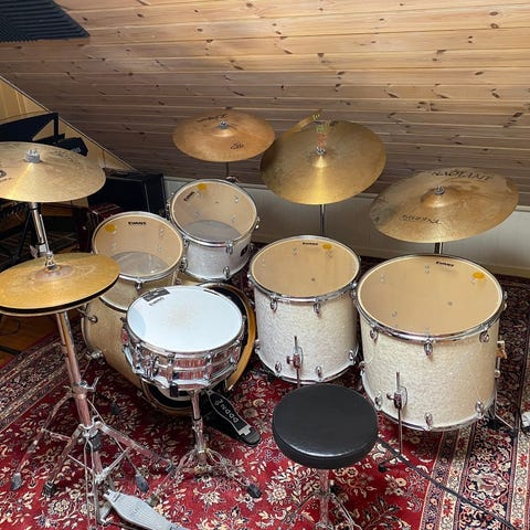 Selger et Ludwig Classic Maple trommesett i White Marine Pearl-finish, kjent for varm, åpen og svært musikalsk tone. Settet er i flott stand, pent behandlet og lite slitasje.