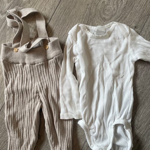 H&M ull body og bukse i lys brun/beige farge, størrelse 68, egnet for både jenter og gutter. Settet består av en langermet body med knapper ved skulderen og en bukse med elastisk midje. Laget av myk ull som gir varme og komfort.