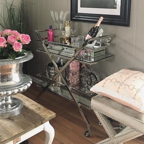 Konsollbord med glassplate og sølvføtter og sølvkanter