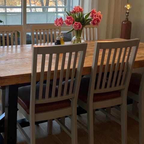 Selger et sett med seks flotte spisestoler i heltre eik. Stolene er i god stand, pent brukt, og har et tidløst design som passer inn i de fleste hjem. De er svært solide og komfortable.