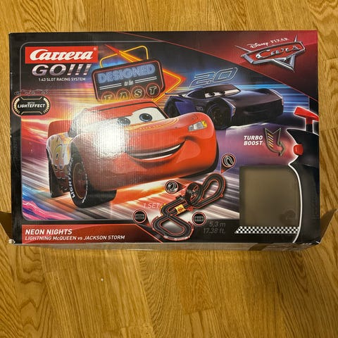 Super Mario Mario Kart Carrera GO! radiostyrt bilbane med tilbehør. Inneholder banedeler, radiostyrte biler og dekorasjoner. Egnet for barn som liker bilspill og Super Mario-tema.