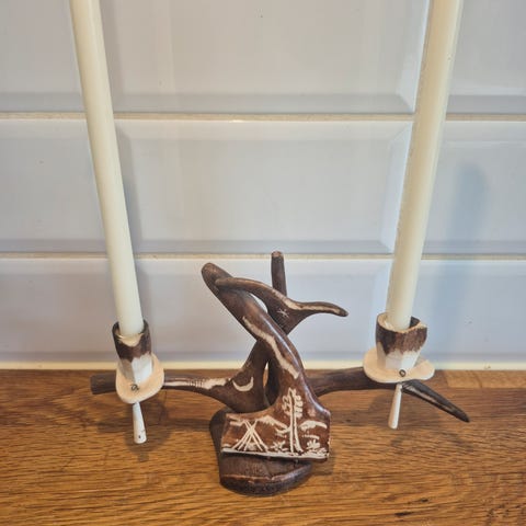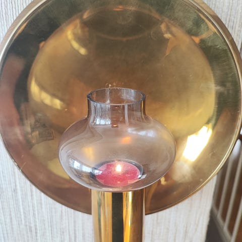Morsom lysestake i messing m/grønn skjerm i metall. Lysestaken er 20,5 cm høy.