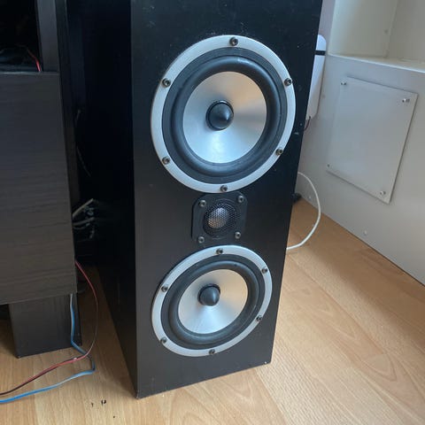 Jeg selger en Bowers & Wilkins (B&W) CC6 senterhøyttaler som reparasjonsobjekt / deleobjekt. Viktig: Diskantelementet (tweeter) mangler, og frontgrillen (grillen foran) mangler også, så høyttaleren selges som den er. Typiske spesifikasjoner som oppgis for B&W CC6: 2-veis ventilert (vented-box) senterhøyttaler med 2 x 5" mid/bass og 1 x 1" diskant (merk: diskanten mangler på dette eksemplaret), frekvensrespons oppgitt rundt 85 Hz–20 kHz (±3 dB), følsomhet ca. 89 dB (2.83V/1m), nominell impedans 8 ohm (minimum oppgis rundt 4,3 ohm), anbefalt forsterkereffekt ca. 25–100 W inn i 8 ohm (noen oppgir høyere topp/belastning avhengig av kilde).