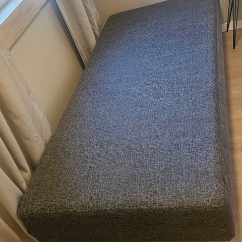 Selger en enkeltseng 90x200 cm med to praktiske oppbevaringsskuffer. Sengen er i lys brun farge, pent brukt og uten merker. Den er ferdig montert