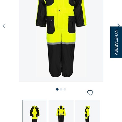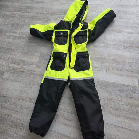 Kjeledress vinter for barn i fluoriserende gul med sort farge str 10år. Avtagbar hette med 4 lommer foran og 2 bukselommer bak.Selges billig da den trenger en ny glidelås,og er litt lappet men ellers like god,god og varm,synlig,og sitter godt på.Kjøpt ny for 1693 på Wenaas sin side. Vanntett.