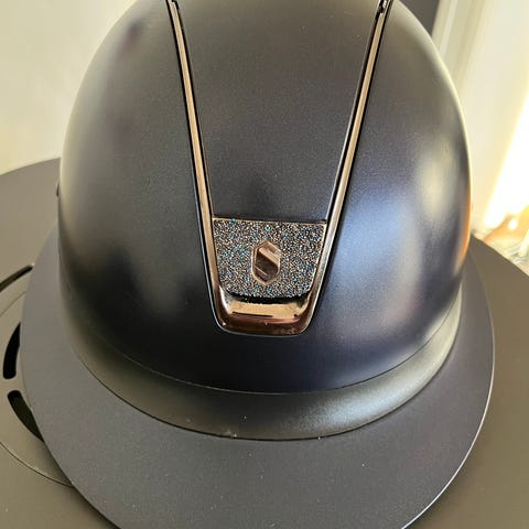 Pent brukt svart ridehjelm fra Samshield. Egendesignet med Swarovski på «S» bak og på blazon. Alcantara på toppen. Str M i skallet. Følger med åpen liner str M-58. Aldri vært i bakken.