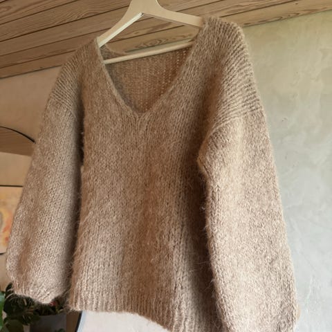 Lite brukt sort håndstrikket julegenser med angora figur og perlemotiv brodert på.