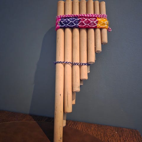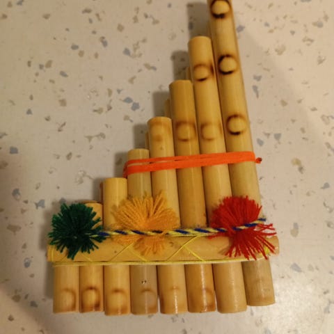 Fløyta er 28 cm. lang og har 11 piper. Bredde 5 cm. Laget i bambus. Den har enkel dekor og pålimt notemerker. Er et lag blank lakk (?) ytterst. Vekt 66 gram. Ser et par små ubetydelige bruksspor, fremstår i pen stand. Jeg kan ikke spille men fikk lyd i den. Har kun hengt til pynt hos meg.