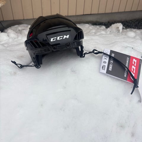 CCM FitLite 3DS ishockeyhjelm i størrelse XS, svart farge. Hjelmen har et metallbur for ansiktsbeskyttelse og er sertifisert med HECC-standard. Designet for ishockeybruk.