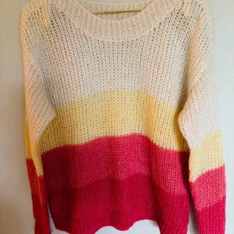 Stripet genser i myk strukturstrikket ullblanding med rund hals og ballongerm med høye vrangborder. Genseren har ledig passform
