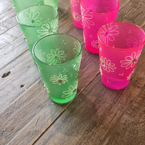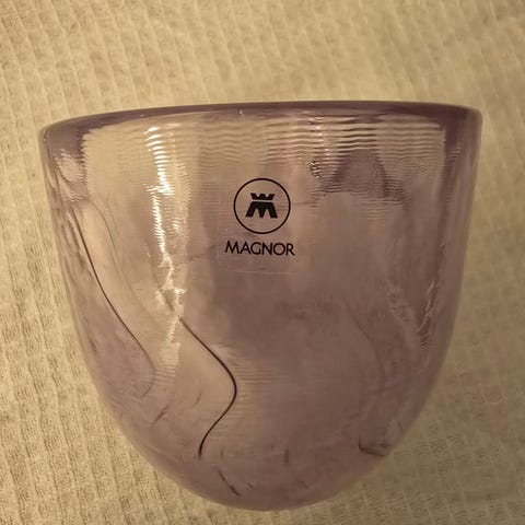 Magnor Glassverk dekorasjonsglass i rødt og grønt. Settet består av to deler med unike fargekombinasjoner, egnet for dekorasjon.