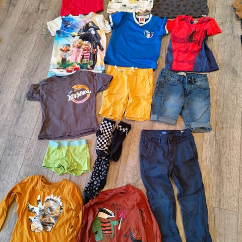 Newbie barneklær for gutt i størrelse 110. Inneholder joggebukser, olabukse, hettegenser, vanlig genser og T-skjorte. Pent brukt av ett barn.