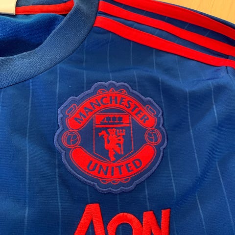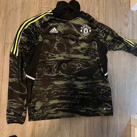 Adidas Manchester United fotballgenser i størrelse L. Genseren har fin passform og er hovedsakelig svart med røde og grønne detaljer. Laget av materiale egnet for sport, spesielt fotball.