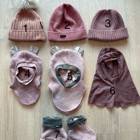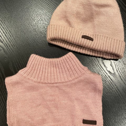Kjempefint sett med lue, votter og tøfler i 100 % merinoull, i en nydelig gammelrosa farge. Veldig pent brukt, fremstår som nytt. Kjøpt høsten 2025 på barnas hus, brukt til 1 barn.