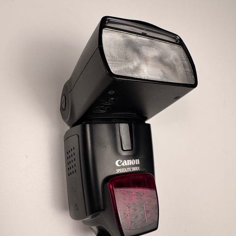 Canon Speedlite 580EX i god stand. Kraftig og pålitelig blitz kjent for rask opplading og solid konstruksjon.