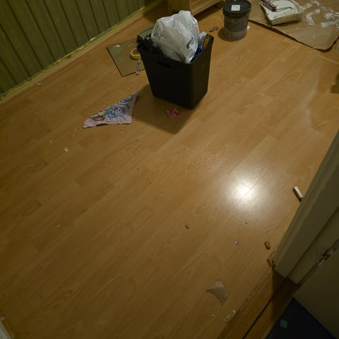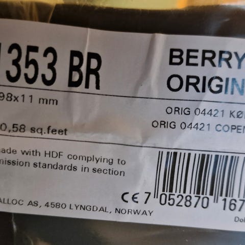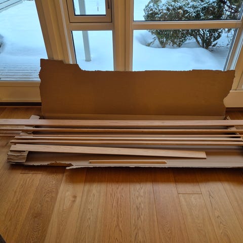 Rester etter gulvlegging. 3-stavers eikeparkett fra Opus. Ukjent alder, men antagelig 2003-2005