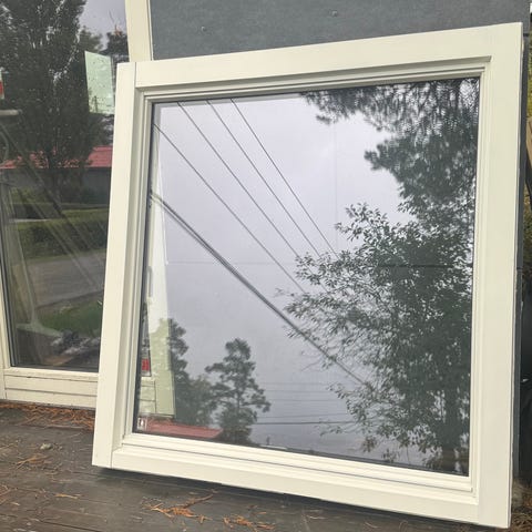 NorDan Kombinasjonsvindu med fast karm og innadslående tofløyet ramme. Aluminium i farge RAL 7016 matt Antrasitt utvendig. Mål: 119x209 cm. 2 lags glass. Aldri utsatt for regn, stått montert i utstilling i 9 år