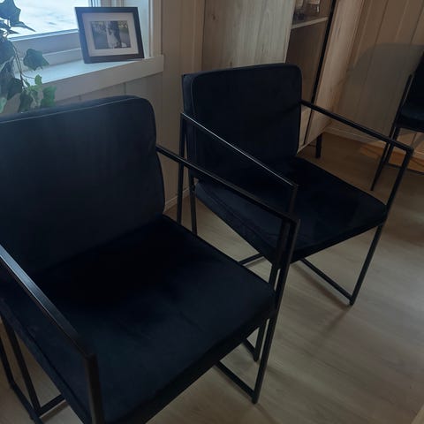 På en av stolene er stangen som er øverst på ryggen knekt, men dette synes ikke. Man merker det kun idet man tar på den. Stolene har blitt impregnert to ganger. Små bruksmerker kan forekomme.