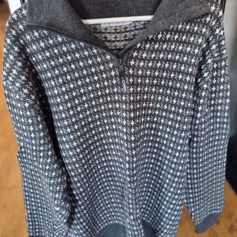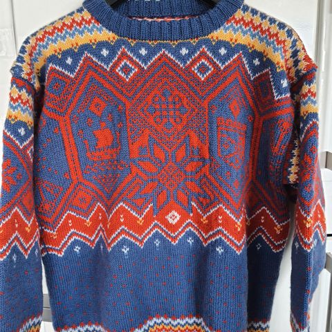 Flott VM genser med motiv fra Trondheim by. Utrolig mange timer strikking, men passet dessverre ikke mottaker.