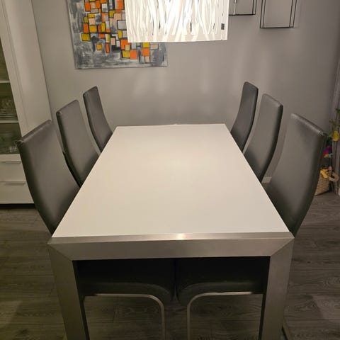 Spisebord og stoler , har to plater til å sette på endene . Stolene er hvit med lys beige trekk i velur , stolene er trekt om .