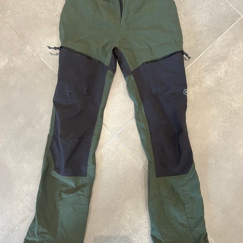 Skogstad Jan turbukse i størrelse 128, fargene grønn og svart. Buksen er laget for utendørs bruk og har forsterkede partier på knær og sete. Den har glidelåslommer og justerbare benåpninger.
