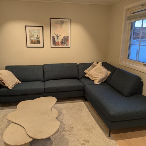 Sofaen er pent brukt og i meget god stand. Ingen hull, rifter eller flekker, og ingen kjente skader. Stoffet er helt og pent.