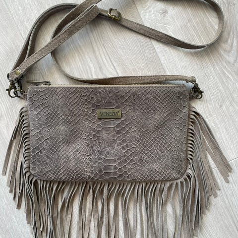 Størrelse 28 cm lang og 28 cm bred. Kan bruke som skulderveske og som håndveske. Har med skulderstropp.