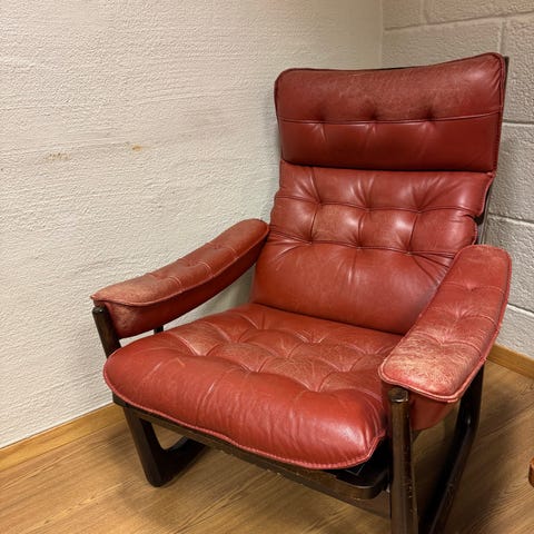 Godt brukt lenestol fra P.I.Langlo selges. Modell: 1813. Fantastisk deilig å sitte i! Stoffet har litt flekker, men mulig det går an å rense. Treverket er helt og fint, men må kanskje pusses og oljes litt noen steder. Se bilder. Må hentes.