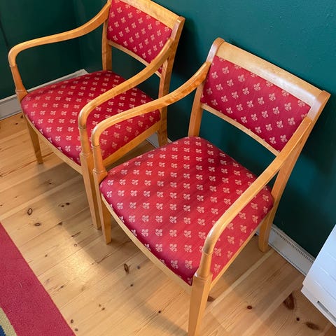 Stor hjørnesalong med spesiallaget bord, 164x 79, h: 57 cm To stoler, sittehøyde 44 cm