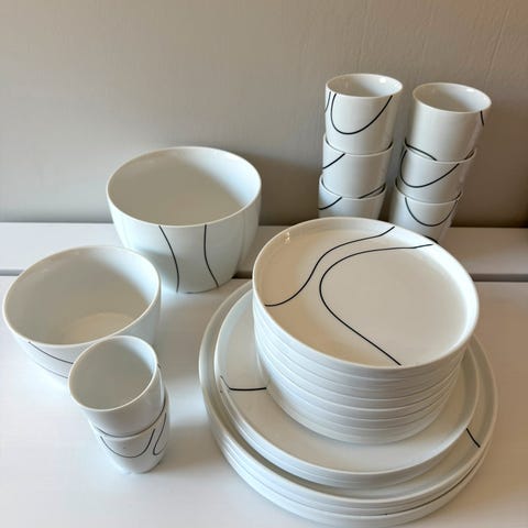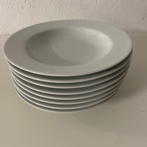 IKEA tallerkener i hvit porselen, 6 stk. Designet med et enkelt og tidløst mønster langs kanten. Egnet for daglig bruk i kjøkken og spisestue.