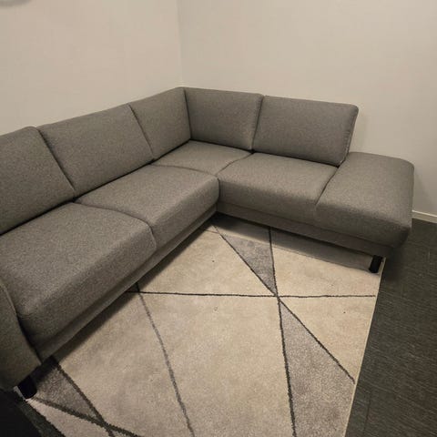Hjørnesofa i grått stoff med plass til flere personer. Passer til stue eller oppholdsrom. Har en L-formet design som gir god sittekomfort og utnytter hjørner effektivt.