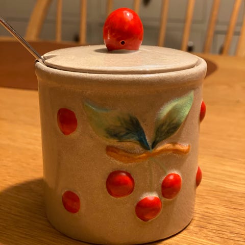 Merket med lapp på siden og under. Krukken er i god stand, men det er bruksmerker på både lokket og glassbollen. Lokket blir sikkert fint igjen med litt pussing.