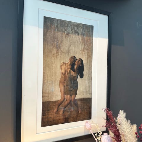 Innrammet bilde som viser en ballettdanser iført tutu. Bildet har en hvit ramme og viser detaljer av danserens ben og tutu i bevegelse.