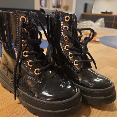 barnesko for jente i størrelse 26. Skoene er svarte og har en blank overflate. Egnet for barn.