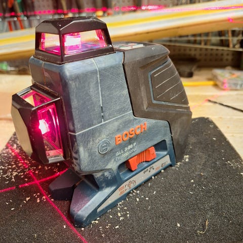 Bosch GCL 2-15 krysslaser med tilbehør og oppbevaringskoffert. Enheten er beregnet for presisjonsmåling og oppmerking i bygge- og anleggsarbeid.