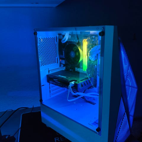 HP Pavillion TG01-2023no stasjonær PC selges sammen med Lenovo skjerm og med Razer headset, tastatur og mus.