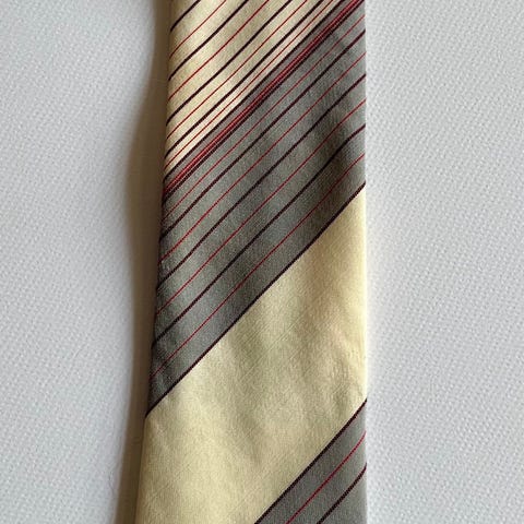 Slips i polyester med fin struktur, stripet i burgunder, røde, hvite og grå nyayanser.