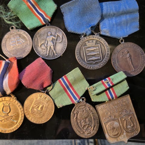 Asserøy medaljer i ulike metaller inkludert gull, sølv og bronse.