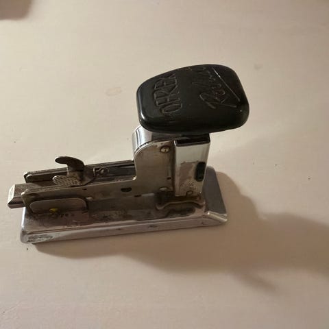 Hotchkiss No.1 stiftemaskin. Stiftemaskinen har dekorative detaljer og en solid base, laget i metall. Merket «Made in USA» under.