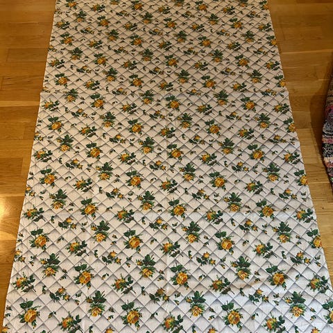 Grønt og hvitt mønstret stoff fra 60-70 tallet. Antagelig polyester. Ikke elastisk. Bredde 156 cm, lengde 210 cm.